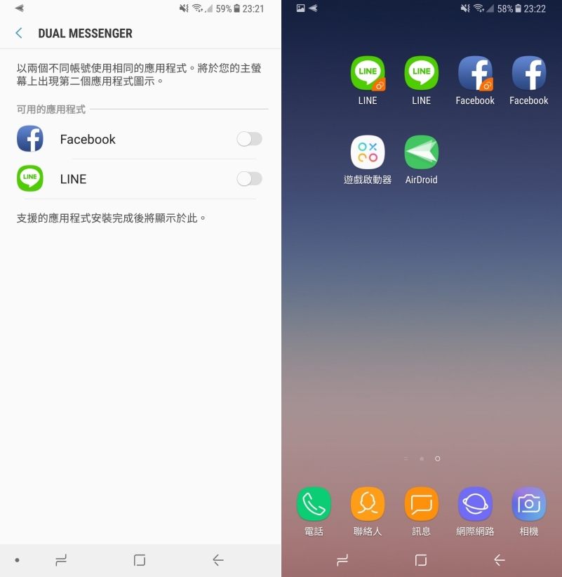 如果社群帳號雙開的需求,可以透過內建的 DUAL Messenger 功能直接開啟分身程式,就可以直接登入二個帳號了。