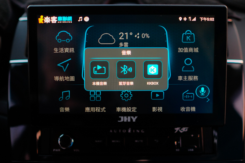 音樂的部份可以播放本機(USB 隨身碟或記憶卡),或是透過藍牙連線播放手機音樂,以及預載的 KKBOX。