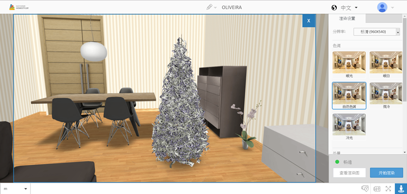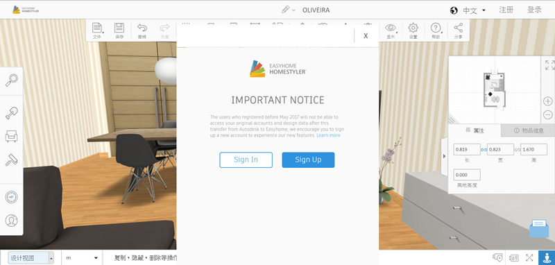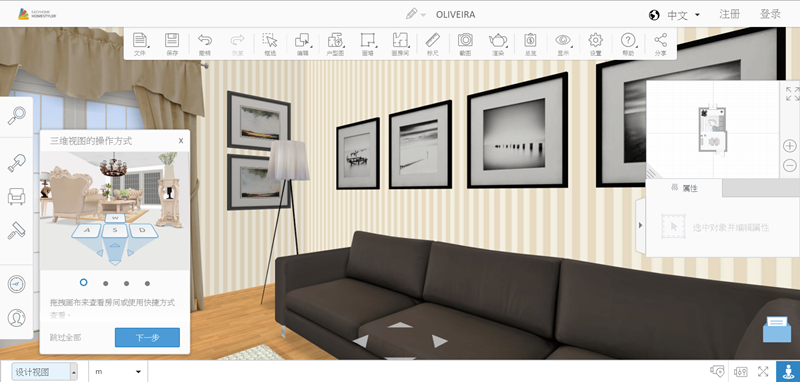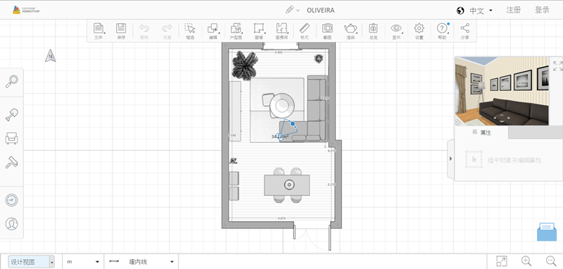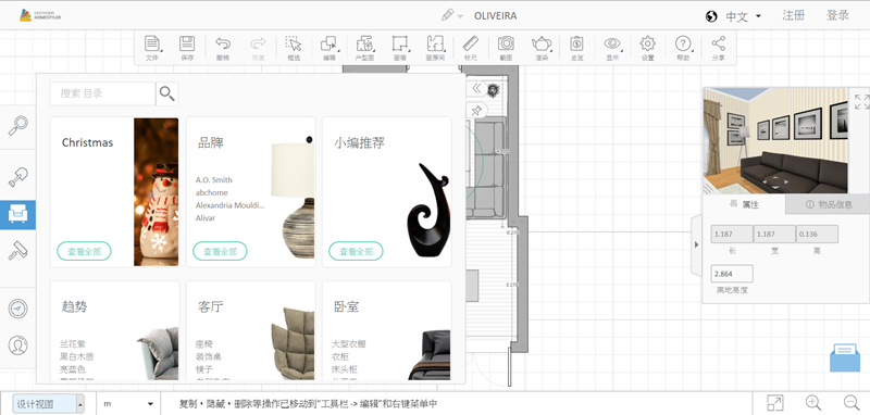 作為一個沒有任何基礎的普通人,當然是從現有案例入手比較快,進入後中間編輯區是以平面圖顯示,上排是框選、畫房間或牆面、標尺等工具,左排是各種建築及家具樣式目錄,右邊有一個三維預覽視窗。