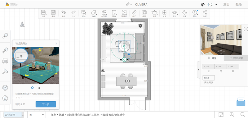 隨便點擊一個物件,3D 視窗底下會顯示尺寸可調整,初次使用也會提供如何移動的簡單教學。