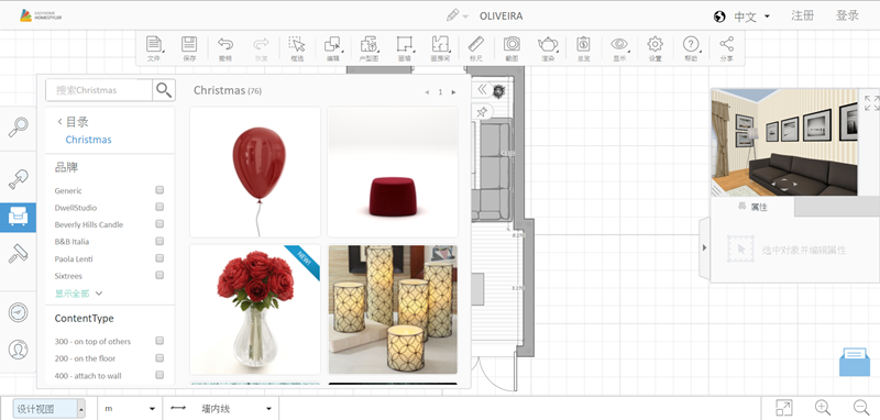 來加個家具吧,打開目錄可從品牌或類別進入,包括客廳、餐廳、浴室、廚房、臥室、辦公室、電子產品等設備應有盡有,要放個人進去也行。