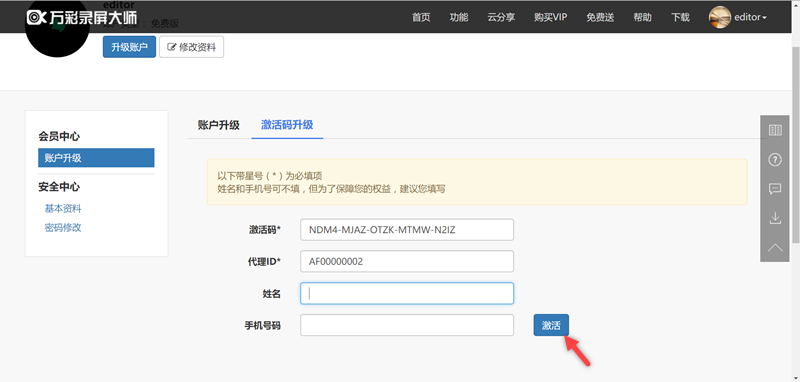 照步驟安裝完成後,回到官網登入,如果之前有用過「萬彩動畫大師」就用同一個帳號即可不用再註冊,然後進到會員中心帳戶升級區,輸入激活碼跟代理 ID,這裡阿湯使用的是