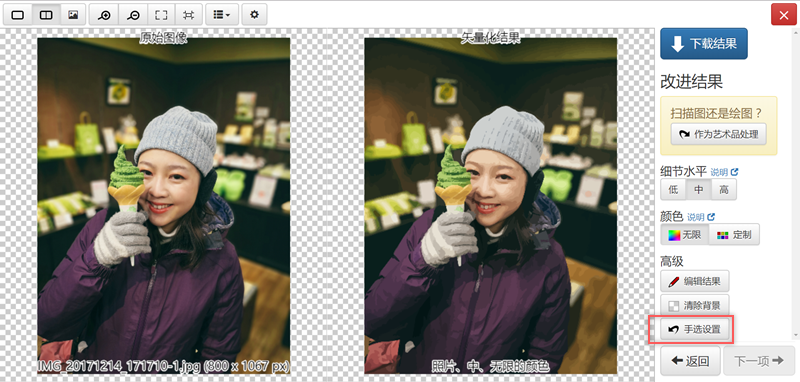 大概花個十幾秒分析與處理,完成後會顯示原始圖像跟向量化的結果,這張雖然原始的解析度有 800*1067px,但用來轉換後顯然不夠大,從臉上有點油畫的感覺就知道,點右下角「手選設置」調整。