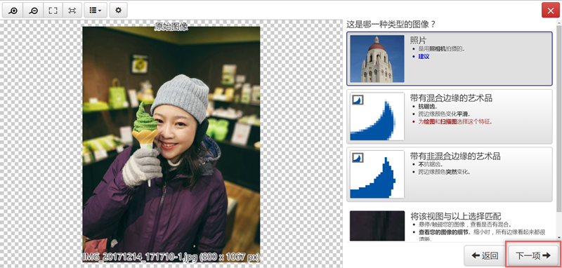 選擇圖像類型,在分析的時候程式就判定是照片了,如果判讀錯誤也可以更改成帶有混合或非混合邊緣的藝術品,點下一項。