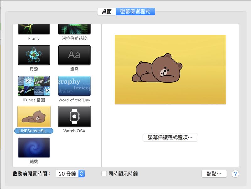 以 「熊大懶洋洋」的 Mac 版本為例,只要在官網點選 Mac 版本下載後解壓縮,就會出現請你同意安裝的選項。點選同意後進入「系統偏好設定」>>> 「桌面與螢幕保護程式」>>>「螢幕保護程式」之中,便能在下方看見「熊大懶洋洋」的螢幕保護程式選擇,你就能看見那緩慢一屈一伸從左移動到右的熊大... 繼續面無表情卻可愛的從你面前經過。