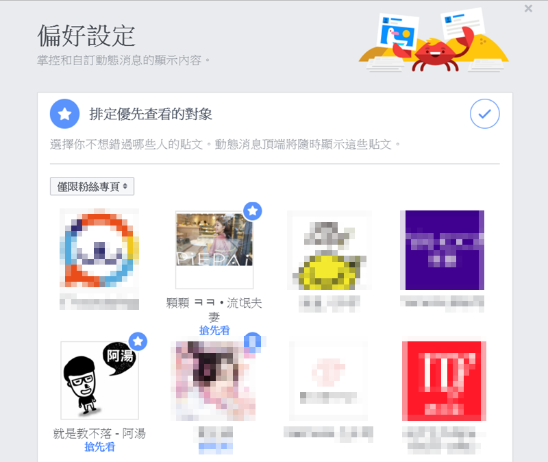 如果選擇僅限粉絲專頁就會將你所有已加入的粉專都列出,包括你之前就有設搶先看的,會以藍星星顯示在頭像右上角,再點一次就會消失,同樣的在這裡點其他粉專就會顯示藍星星表示已加入。