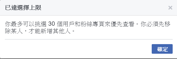 要特別注意的是最高只能設 30 組,包含用戶跟粉專,名單超過就要先刪才能加,其實設太多組也沒有意義,就算你朋友名單不到一百人、粉絲團也加得不多,還是會降低即時查看的機率,自己做取捨吧。