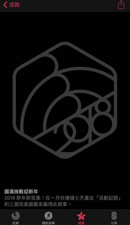 Apple Watch 的限定徽章在 2017 年就曾經推出,這次同樣也是以 7 天為限,理論上是將會從 1 月開始至 1 月 25 日(因為需要 7 天的紀錄),不過一月還沒到就已經看到國外有用戶竟已經默默完成這項挑戰,因此便能在 Apple Watch 的「活動紀錄」 App 中,「成就」分頁裡看見這枚新年限定的 2018 徽章。