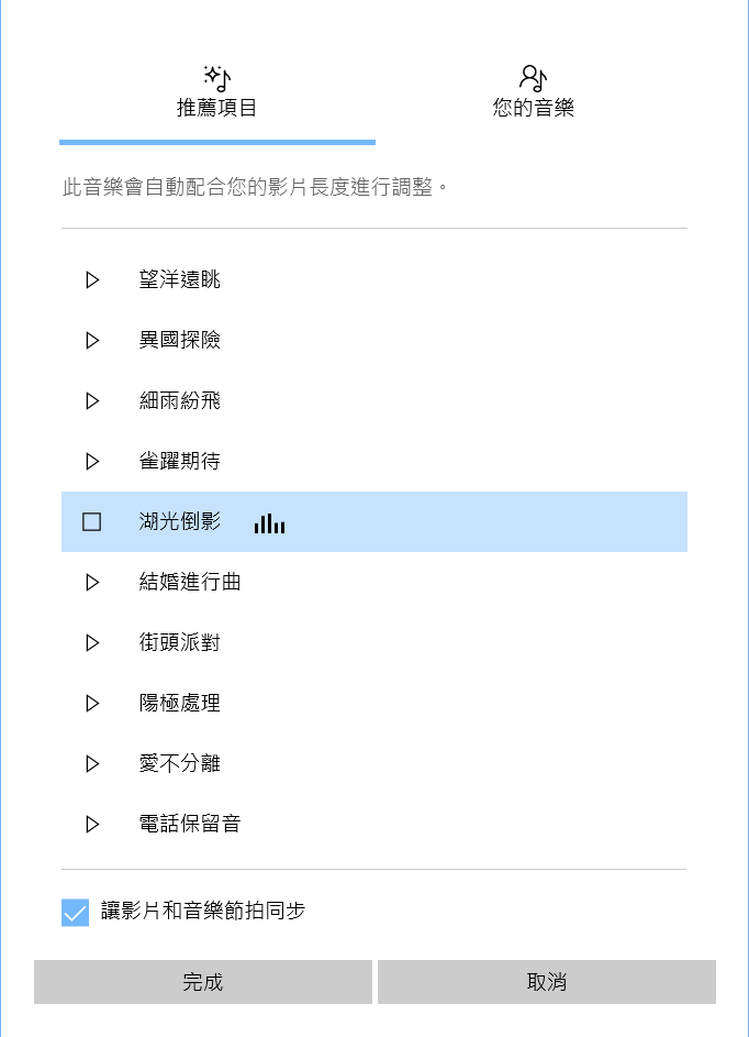 音樂目前有 31 首,可點選試聽,阿湯是覺得都不錯聽蠻適合當影片配樂的,也能用自己電腦有的音樂,重點是可勾選「影片和音樂節拍同步」,自從阿湯寫過「