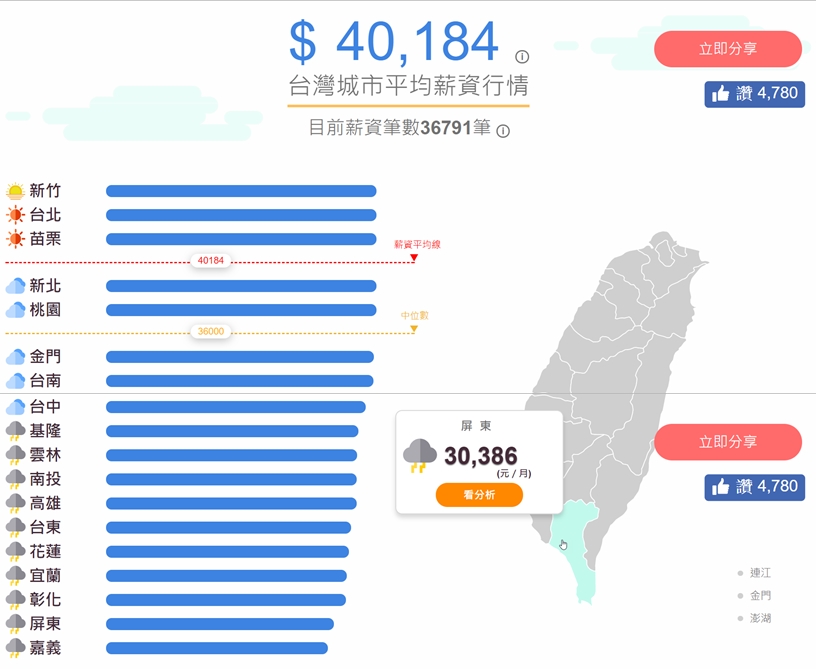 長條圖加上台灣地圖讓你一眼就能辨別各縣市的情況,前三名是新竹、台北、苗栗(有點意外),倒數三名依序是嘉義、屏東、彰化,難怪住嘉義的朋友要北上求職啊…當然這只是平均值,各行各業一定也會有所不同。