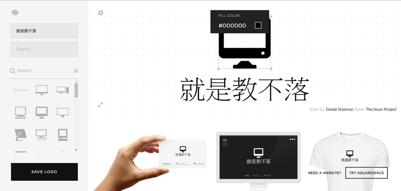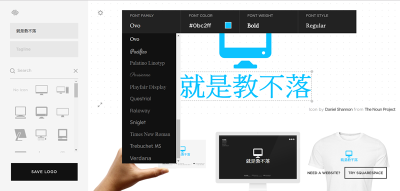 試試看內容用英文,字體調整的自由度果然高很多,可一一套用到喜歡的,對了底下都會有範例,可預覽商標在名片、電腦桌面、T 恤的樣子。