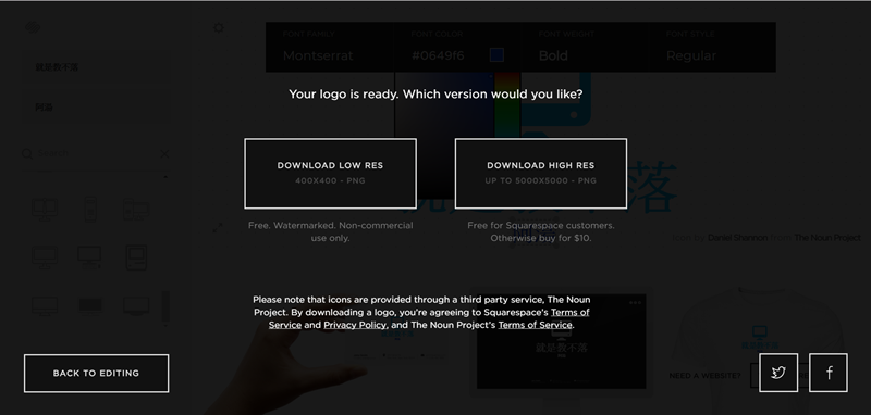 點左下「SAVE LOGO」後出現兩種選擇,左邊是有浮水印、400*400 的 PNG 檔、不可商用,右邊是 5000*5000 的 PNG 檔,解析度很高但要付費購買,大家就看需求了。