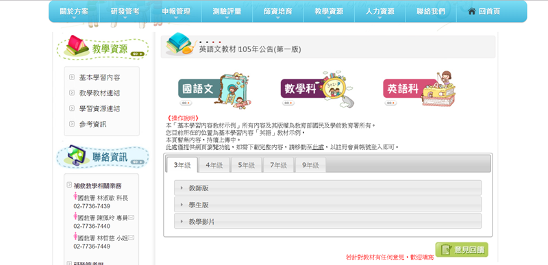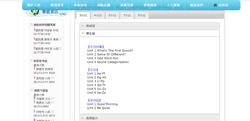 來看英文教材,分 3、4、5、7、9 年級,教師版、學生版,有的年級還有教學示範影片。