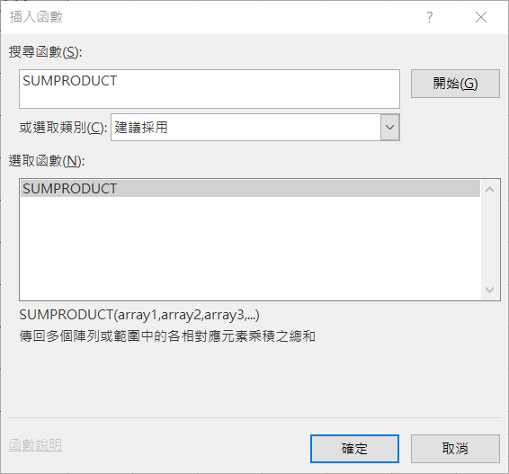 插入函數,如果很熟練也可直接在空白列輸入公式,阿湯帶大家走的是比較基礎好懂的路線,搜尋到「SUMPRODUCT」,按確定。