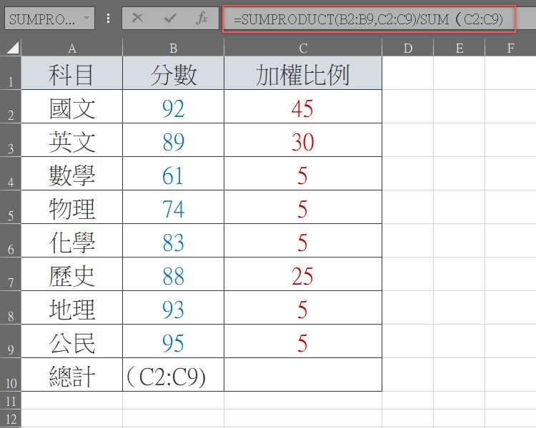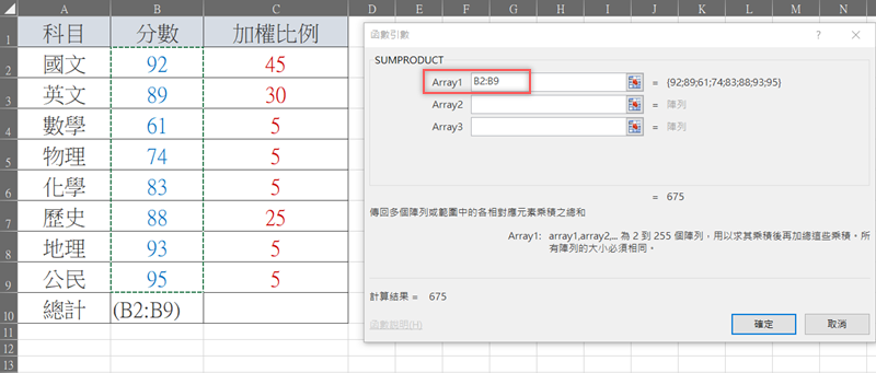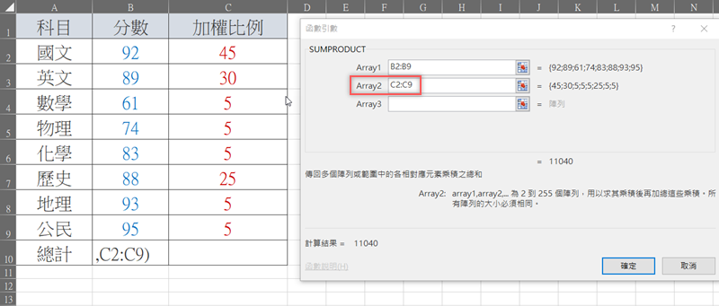 第二個是加權比例,範圍是「C2:C9」,手動輸入或用滑鼠拖曳選取都 OK。
