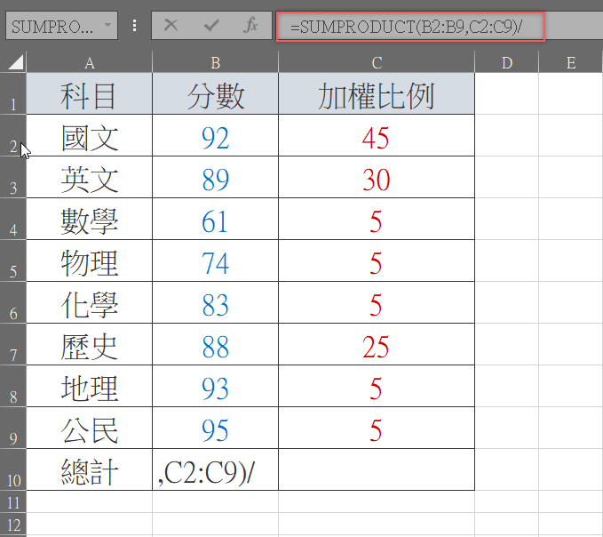 重點來了,如果按下確定,出現的值將是所有科目分數加權後的總合,以這個例子來看就是(B2 * C2)+(B3 * C3)+(B4 * C4)+(B5 * C5)+(B6 * C6)+(B7 * C7)+(B8 * C8)+(B9 * C9),而我們要算的是平均,必須將這個總和再除以原始分數才是答案,先在公式後面輸入「/」。