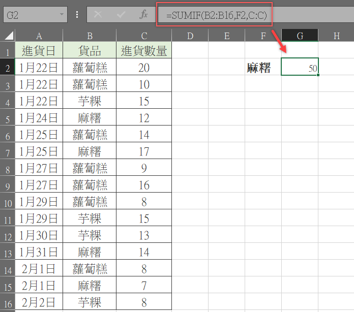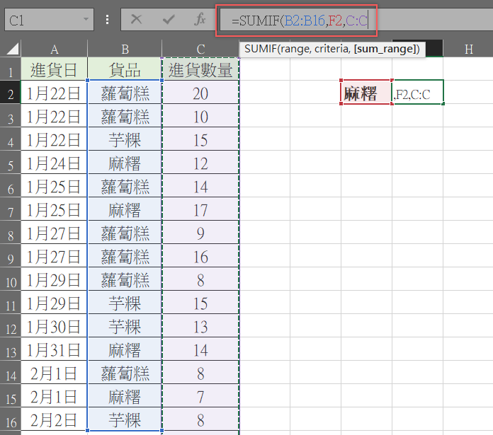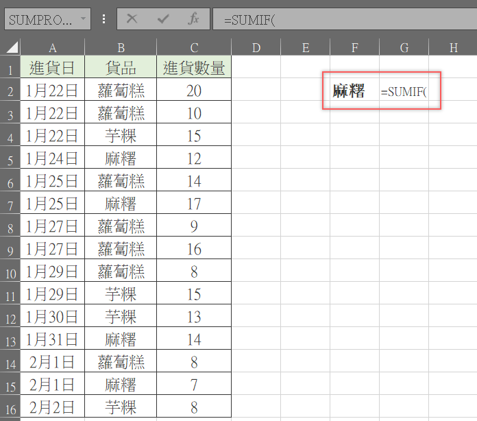 前面阿湯說的可能有點抽象,來看表格範例應該就懂了,以這份表格來說,不同天數、不同品項都分別有貨品進量,假設我們只要知道「麻糬」在這些天的進貨數量,先在空白列輸入「=SUMIF(」。