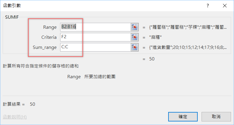 也能從插入的地方輸入函數可能會比較清楚,意思相同,第一行加總範圍、第二行條件(項目)、第三行加總欄位,按下確定完成計算,就看個人習慣了。