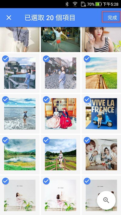 還能批次上傳,手指按住一張相片不放,滑動選取範圍後再點完成即可,但阿湯覺得用起來不太順,有時候會不好選取,不知道是不是手機的關係,大家試試看吧。