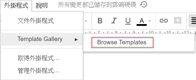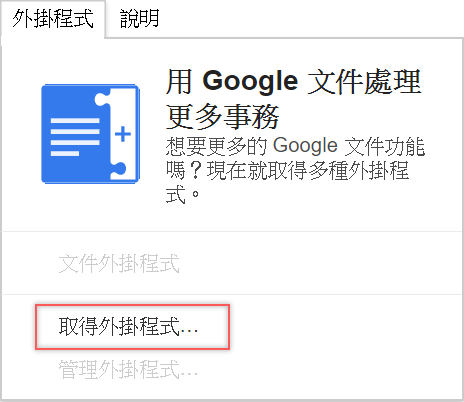 開啟一份 Google 文件,點開上方的外掛程式 → 取得外掛程式。