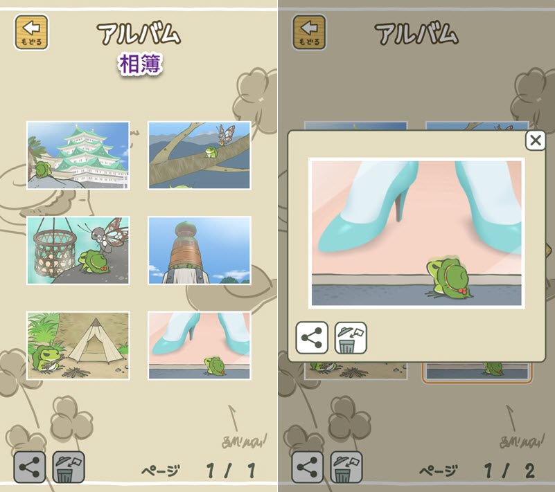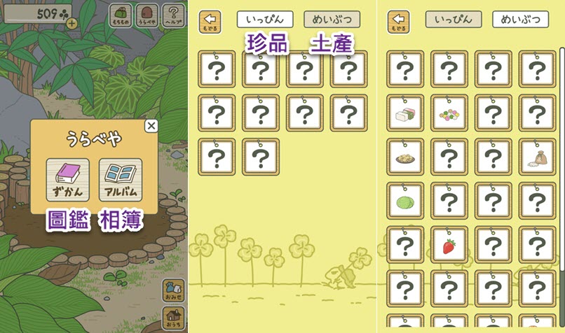 先從庭院右上角進入目錄,分為圖鑑和相簿,圖鑑部分有珍品及土產,每次蛙蛙旅行回來都會帶一些土產,可以拿來招待拜訪的朋友,朋友吃完後也會給你禮物唷。