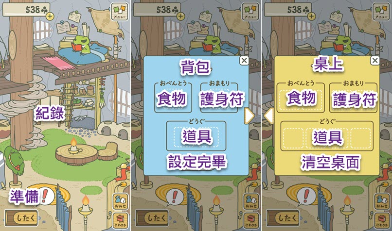 進到家中,點中間的窗簾可以連結到紀錄(目錄),而左下角就是遊戲的重點啦,準備區分背包和桌上,記得幫蛙蛙打包行李牠才有機會出門,桌上也可以放一些東西,蛙蛙可能會自己拿了打包出門,注意桌上放完東西後要點右上角的 X 直接關閉,如果點底下就會清空哦。
