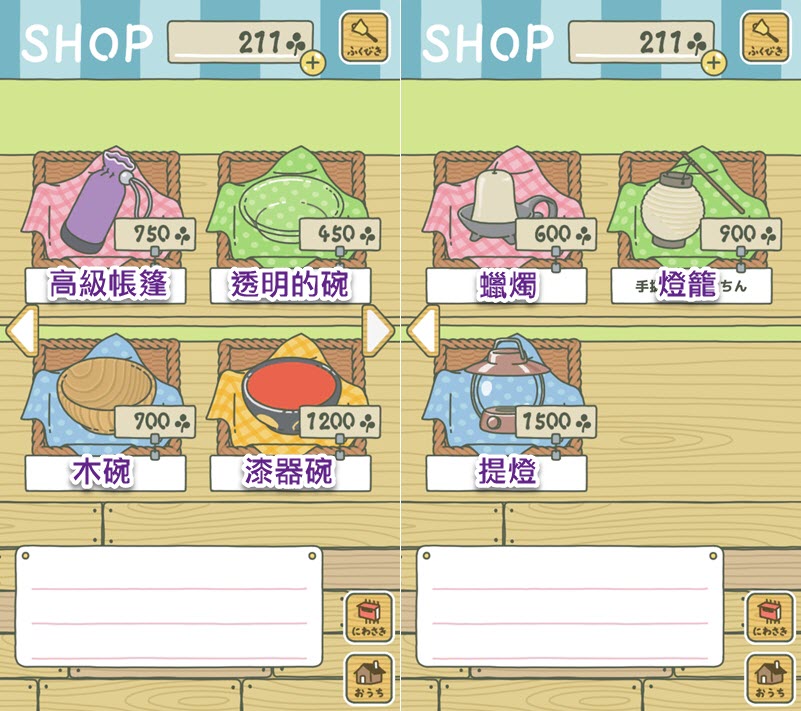 遊戲場景就只有兩個:家裡及庭院,按鈕連結也很簡單,進來就是採收三葉草當作錢幣使用,真的等不及也能點左上角按鈕進入購買(但阿湯真的覺得不需要花錢),一個個來看。