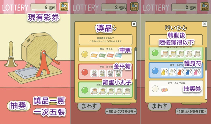 商店右上角可以抽獎,一次五張彩券,獲得方式有購買商品隨機贈送、蛙蛙旅行帶回、信箱廣告、訪客謝禮,或是抽到白球直接換到一張,獎品如下。