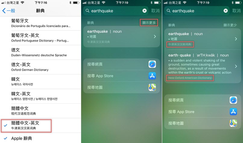 來試試看,輸入英文後會先顯示 APP STROE 及網站的相關內容,往下滑才會看到辭典,點進去後阿湯發現只有來自 New Oxford American Dictiocary 的英英翻譯,沒有中文解釋,是不是少了什麼設定?