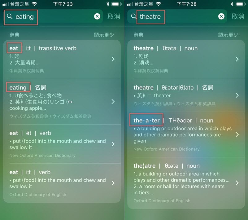 輸入不同型態的單字會連原型一併顯示,像是 eating 會連 eat 都出現在結果欄,另外,英式拼音及美式拼音的不同也會列出,像阿湯輸入的 theatre 是電影院的英式拼音,辭典會幫你將美式拼音的 theater 也列出,算是蠻智慧的功能,給大家參考。