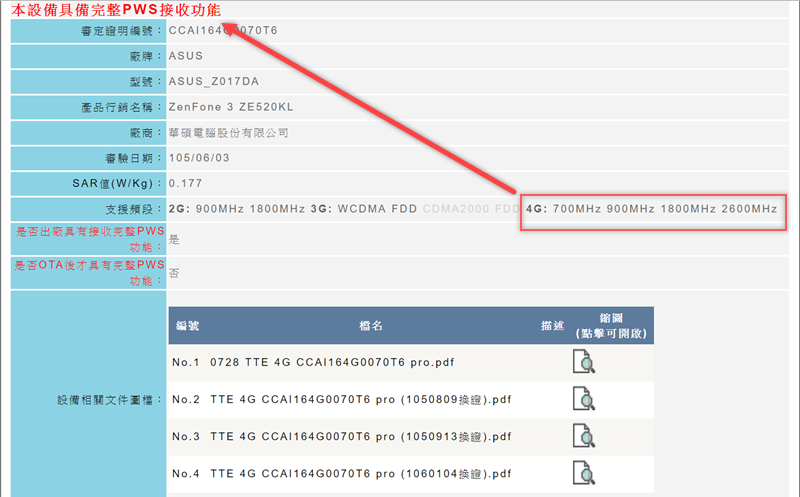 以下面這支 ASUS 手機來說,結果顯示「具備完整 PWS 接收功能」,但只限 4G 用戶使用 4G 手機或部分支援此項功能的 3G WCDMA 手機才能收得到。