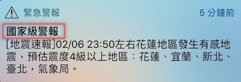 而地震過後(時間不一定)會收到「警訊通知」的縣市,為這次地震有感受到震度的區域,換句話說如果你的所在縣市是 0 級,就什麼也不會收到。