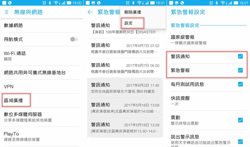 另外如果發布時,手機處於飛航模式、通話中、使用 3G 網路上網、未插 SIM 卡、收不到訊號、APP 背景資料傳輸中、未更新韌體都有可能收不到,還要確認有開啟警訊通知功能,如下圖: