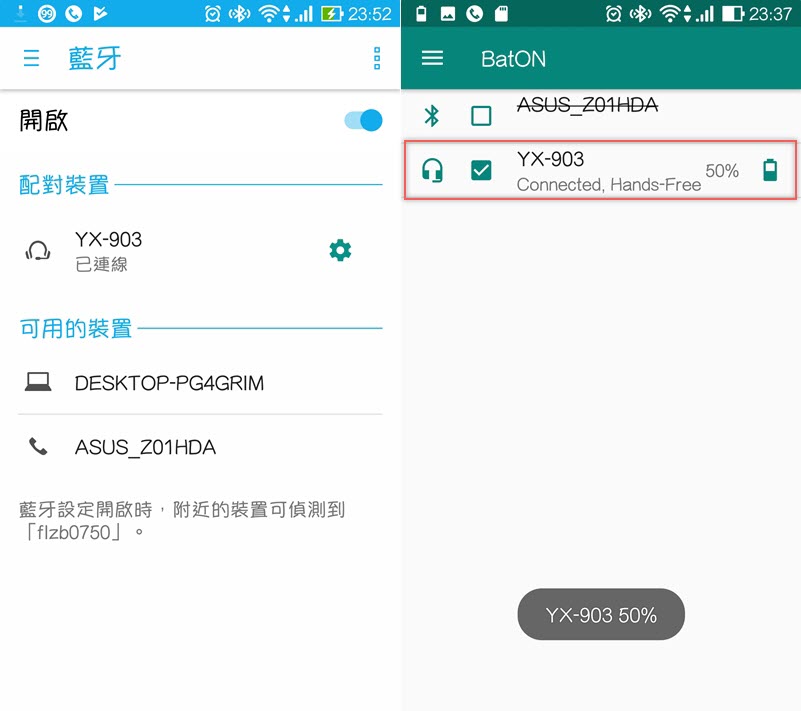 首頁 › 手機應用教學 › 如何在 Android 系統手機查詢藍芽設備的電量(Android 8.1 版本可直接查看) 如何在 Android 系統手機查詢藍芽設備的電量(Android 8.1 版本可直接查看) 發佈日期:2018/2/18 作者:阿湯 分類:手機應用教學 在手機上連接藍芽設備,最常見的就是藍芽耳機了,尤其常常需要接聽電話卻不方便拿起手機的人,但你的耳機剩多少電卻很難看出來,雖然現在 Android 8.1 的版本可直接從設定區查看,包括連接的設備及它們的剩餘電量百分比,但恐怕沒多少人已經用到 8.1 版,Android 8.1 以下的版本就要安裝 APP 來查看,下面阿湯就來示範使用「BatON」這款 APP 來查看藍芽電量。 BatON 使用分享: 一般未升級到 8.1 版的 Android 設備,到藍芽設定區只能看到可連線或已連線的裝置清單,不會顯示電量,但下載 APP 之後只要開啟就會在清單上顯示出來。 可一鍵手動更新或是進入設置,調整關於通知和自動重測的時間。 像要不要顯示通知、可關閉的通知,和要不要自動更新、更新的時間都能調整,就看大家的需求,試試看吧。 BatON 相關資訊: APP 下載:Android