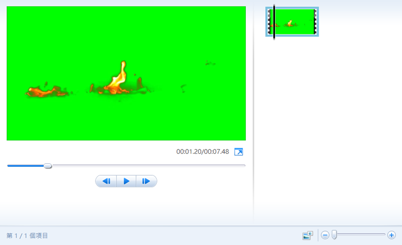 匯入到 Movie Maker 長這樣,約 7 秒鐘的動態火焰,綠色背景應該是方便我們合成。