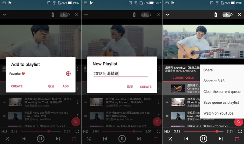 可從底下功能列設定隨機或重複播放,原始歌單也能進行更改、加最愛、移除、分享等編輯功能。