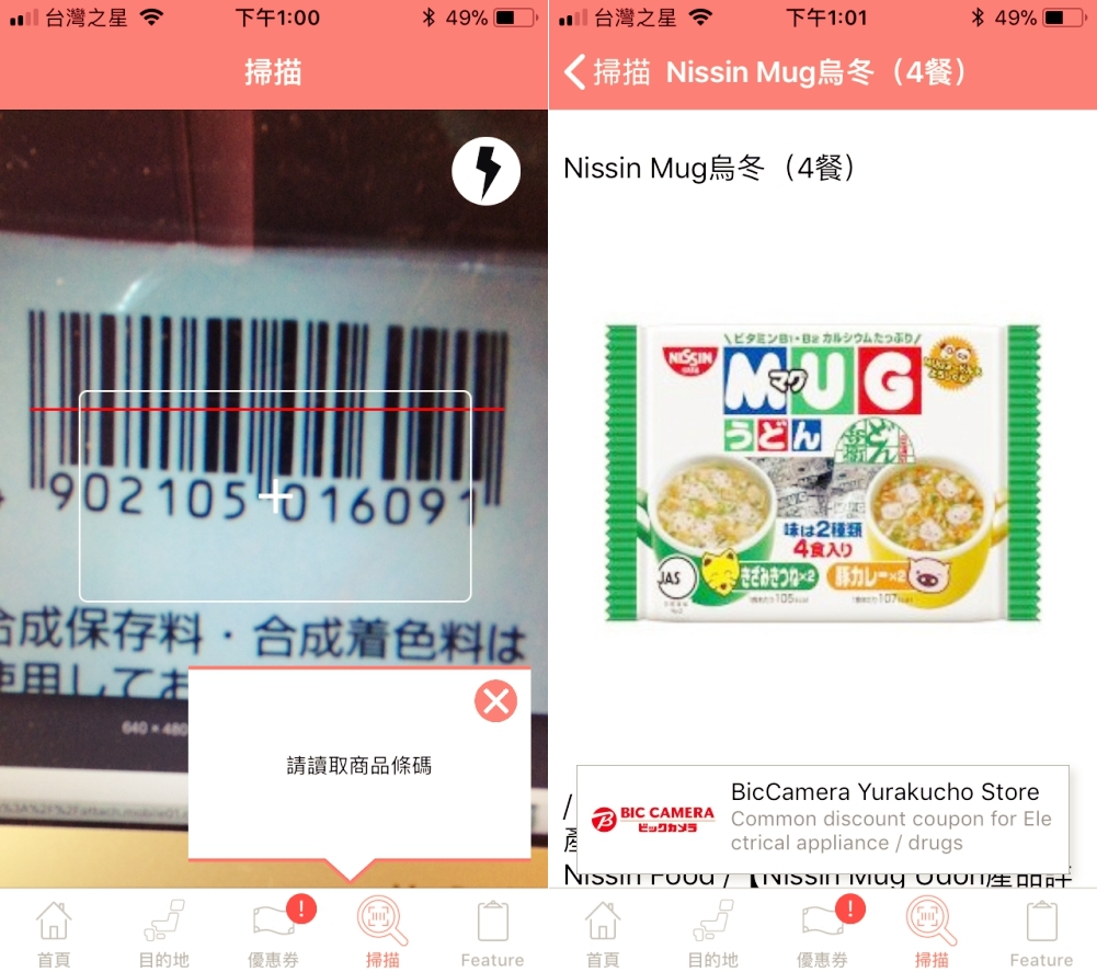 另外還有一個相當實用的掃描功能,如果看到有興趣的日本商品,但不太確定內容、用途等,就可以拿起手機掃描,只要 APP 裡有資訊就會看到中文介紹,讓你在購物時更加方便。