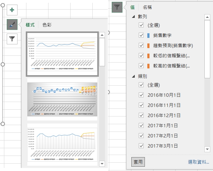 工作表的樣式、色彩,採用的數列及類別都能依需求選擇,調整完再套用即可。