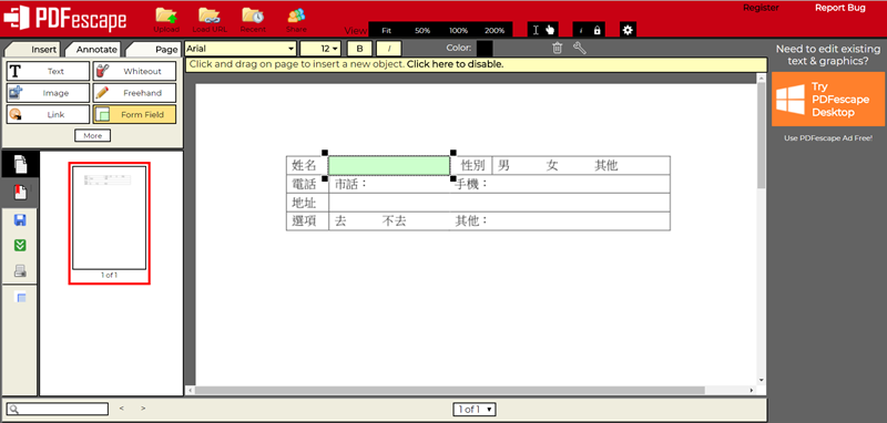 中間就是這次的範例,但這是 PDF 檔,如果用一般純編輯的工具雖然可以置入文字及圖片,但只能一次性,存檔後就固定了,對於需要多次使用的「可填寫」表單,是不適用的,點左邊「Form Field」開始製作。