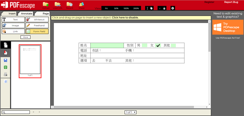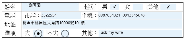 但當你點進去會發現淡藍色區域是可以編輯的,輸入文字或勾選都沒問題,性別項目剛剛設定的是可以多選,而底下的「去╱不去」則是單選的按鈕,但字體大小在設計欄位的時候沒有考慮到所以只能輸入這麼小的字,回去再改一下就好,試試看。