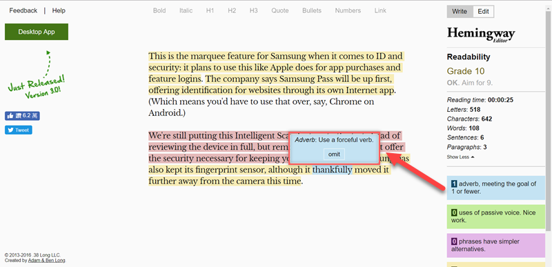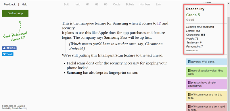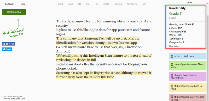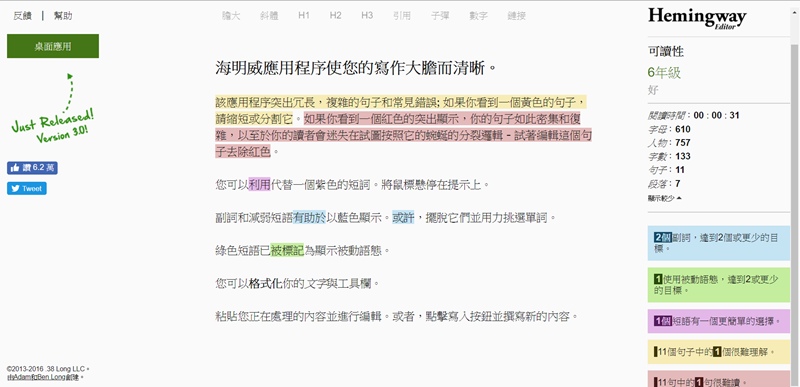 1Checker 都是相當方便又好用的校對及文法檢查軟體,但如果著重在句型方面推薦「Hemingway Editor」這套工具,提供免費的線上版和付費的桌面版,當你輸入文章之後,會利用閱讀能力指數來對文章分級,並以顏色標出難以閱讀的句子,強調的是「可讀性」這點,協助你達到文句的簡潔與通順。