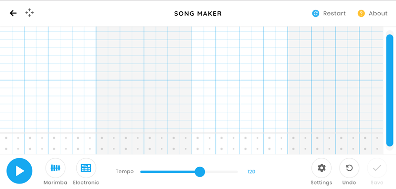 也可以像這樣隨便畫一些圖案當作曲譜,或改用鍵盤上下左右,錯了再按一次取消或點 Restart 整個重來,一起來玩吧。