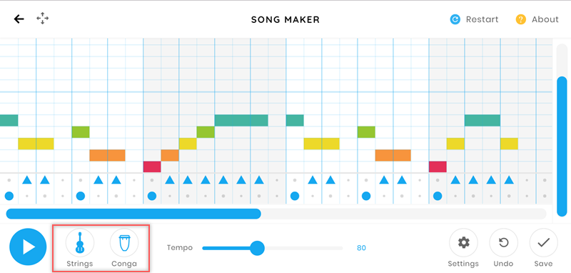 底下圖示左邊是主旋律,右邊是節拍,主旋律可使用木琴、鋼琴、弦樂器、木管樂器、合成器,可以先單純用一種聽聽看,或是搭配打擊樂器小鼓、Blocks、康加鼓、電子音,阿湯是用弦樂器和康加鼓來做。