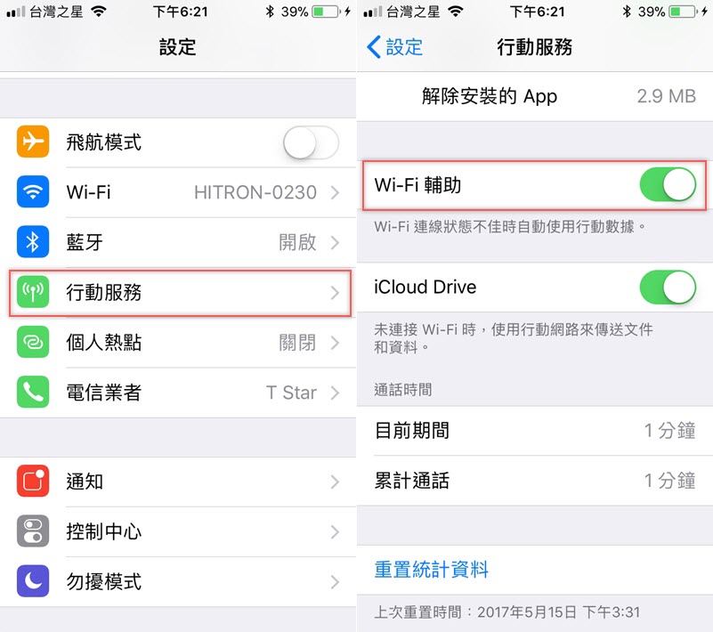 如果在外面使用 Wi-Fi 訊號不好、連線狀態不佳的時候,開啟 Wi-Fi 輔助功能,可以幫你自動連上行動網路,但要注意如果不是吃到飽方案數據量可能會超過哦。