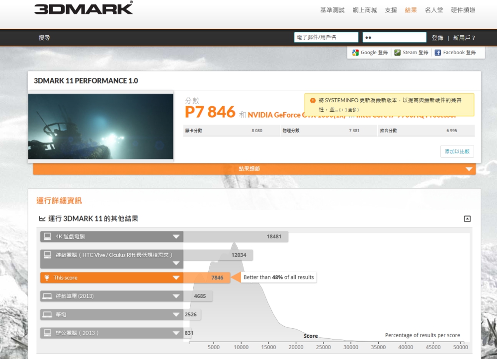 透過 3DMark 11 測試獲得的分數。