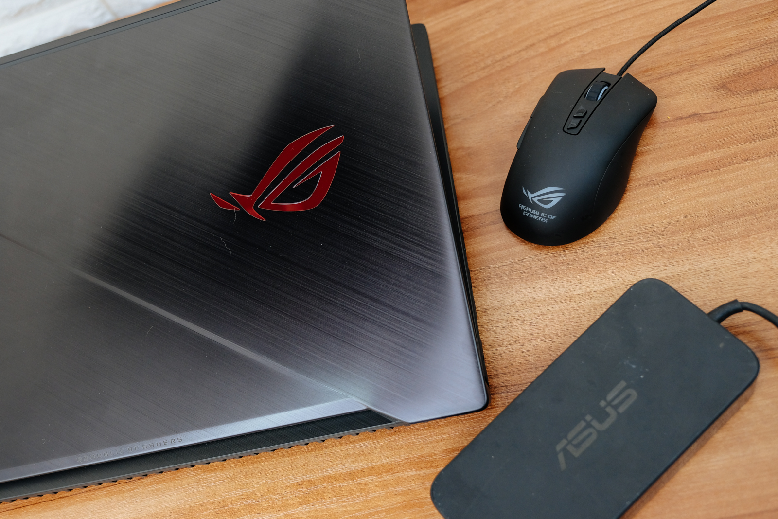 ROG Strix GL703V 的配件包括自家的電競滑鼠以及筆電變壓器。