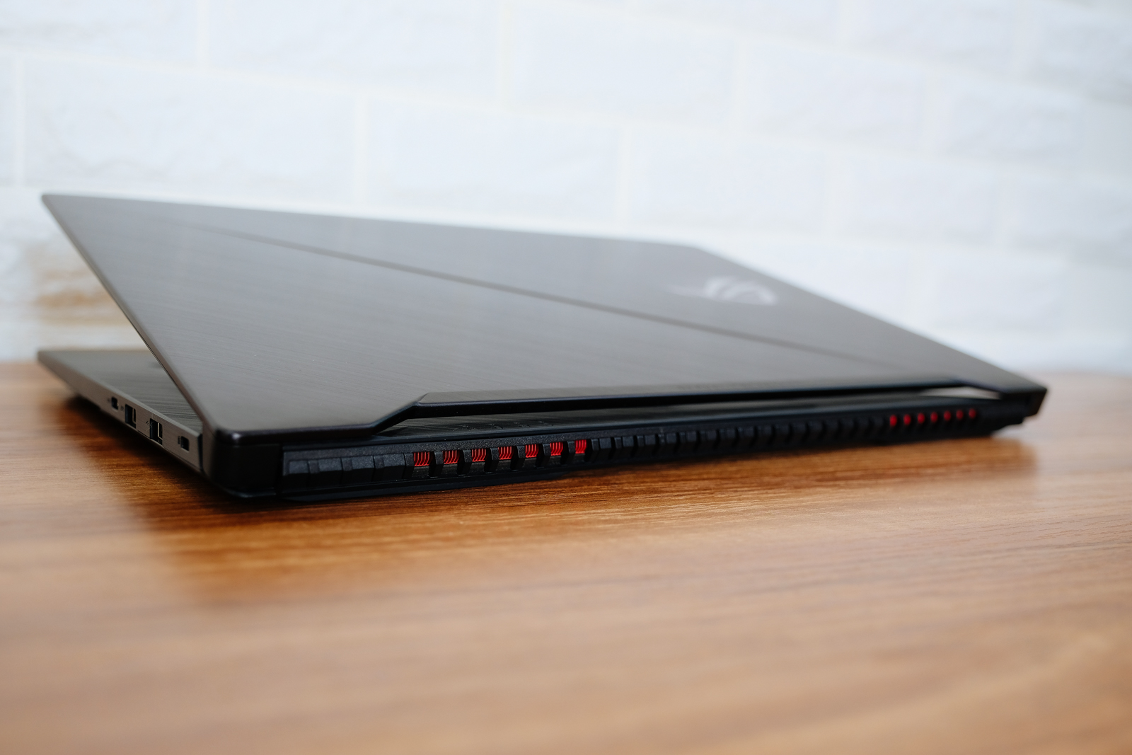 這款 ROG Strix GL703V 機上的敗家之眼在開機時是會亮起紅光的,紅配黑真的就是有一種強烈的電競風格,非常的帥氣,而且可以看到 A 蓋上的髮絲紋設計非常的有質感。