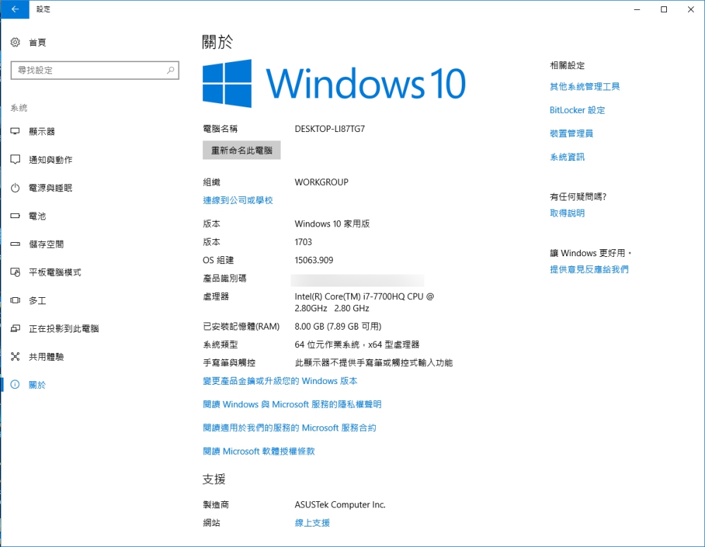 阿湯測試的這款 ROG Strix GL703V 採用的是 Intel(R) Core(TM) i7-7700HQ、8GB 記憶體,顯卡為 NVIDIA GeForce GTX 1050,搭載 Windows 10 Home 作業系統。