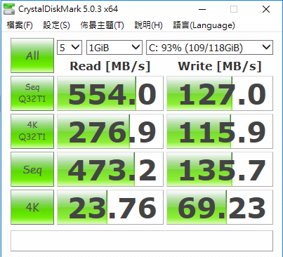 透過 CrystalDiskMark 測試系統槽的 SSD 固態硬碟,效能表現算是中上,容量為 128GB,另外配置一顆 1TB 7200RPM 硬碟讓你可以存放其他資料使用。