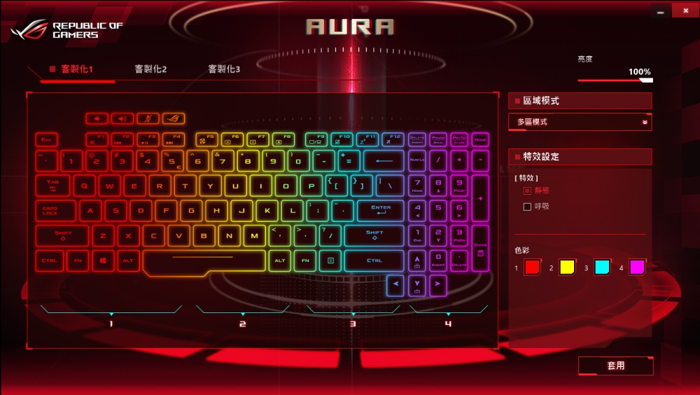 另外背光鍵盤的部份支援 ROG Aura 軟體設定,可以自行調整背光四區的色彩、漸層等,玩起遊戲來讓你聲效具佳,看的就是爽。